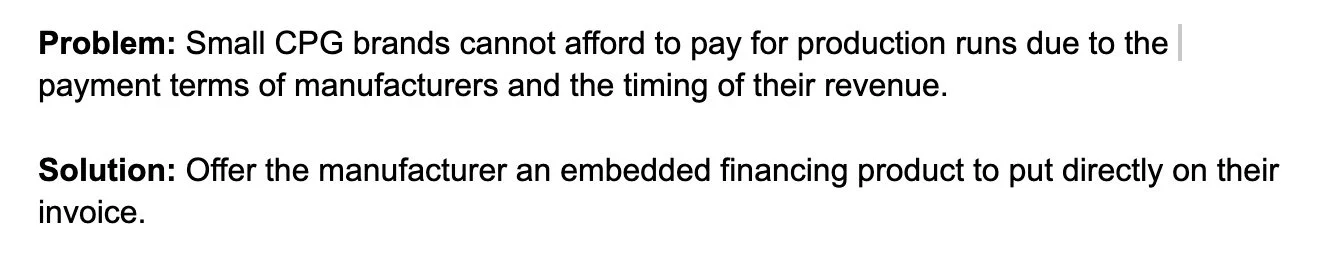 Here’s all the background you need to dig into this one: when a brand is looking to manufacture products with a contract manufacturer, they need to pay the invoice for that production run long before they ever get the revenue from selling the finished goods. This causes a cash flow challenge for them and there is a large market for financial products that solve this problem, from standard loans, to cash advances on future sales, among others.
