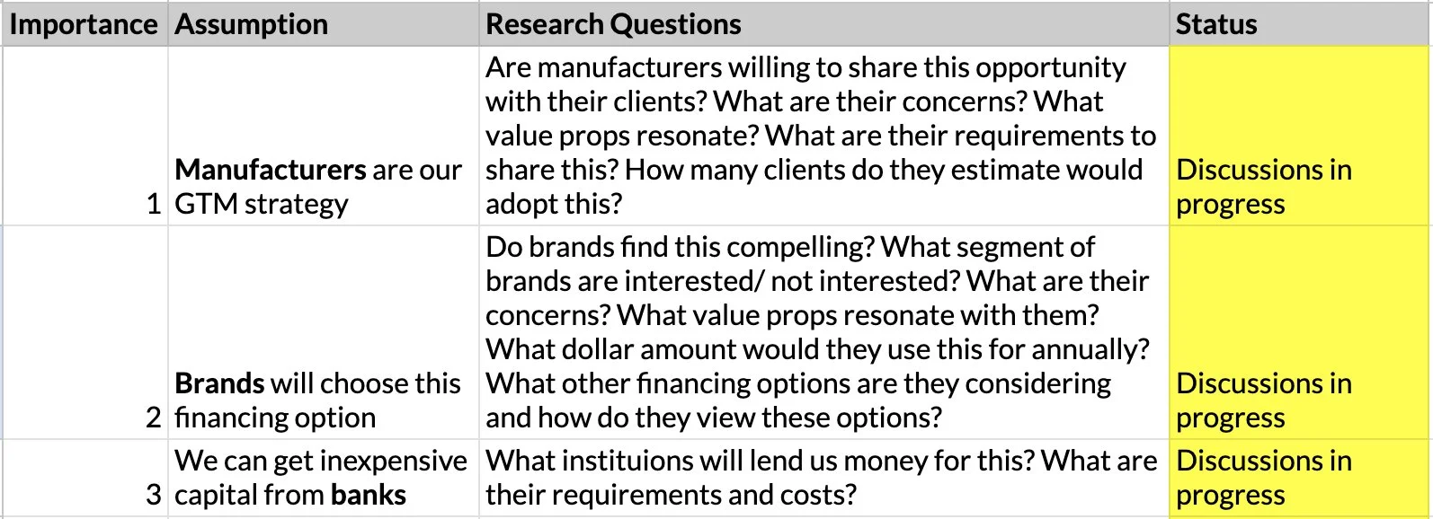 Knowing these goals impacted our validation strategy significantly. For example, because they were aiming to build a high growth business, we knew that validating the revenue potential and market size early on would be critical. Another example: because minimizing regulatory obligations was important to them, we incorporated a validation conversation with a lawyer early on as well.
